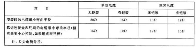 根据GB 50054-95低压配电设计规范中第5.6.39条,电缆敷设的弯曲半径与电缆外径的比值,不应小于表3的规定。