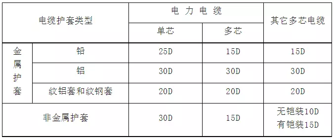 无铠装电缆,应不低于电缆外径的6D;铠装或铜带屏蔽电缆,应不低于电缆外径的12D;屏蔽软电缆,就不低于电缆外径的6D。